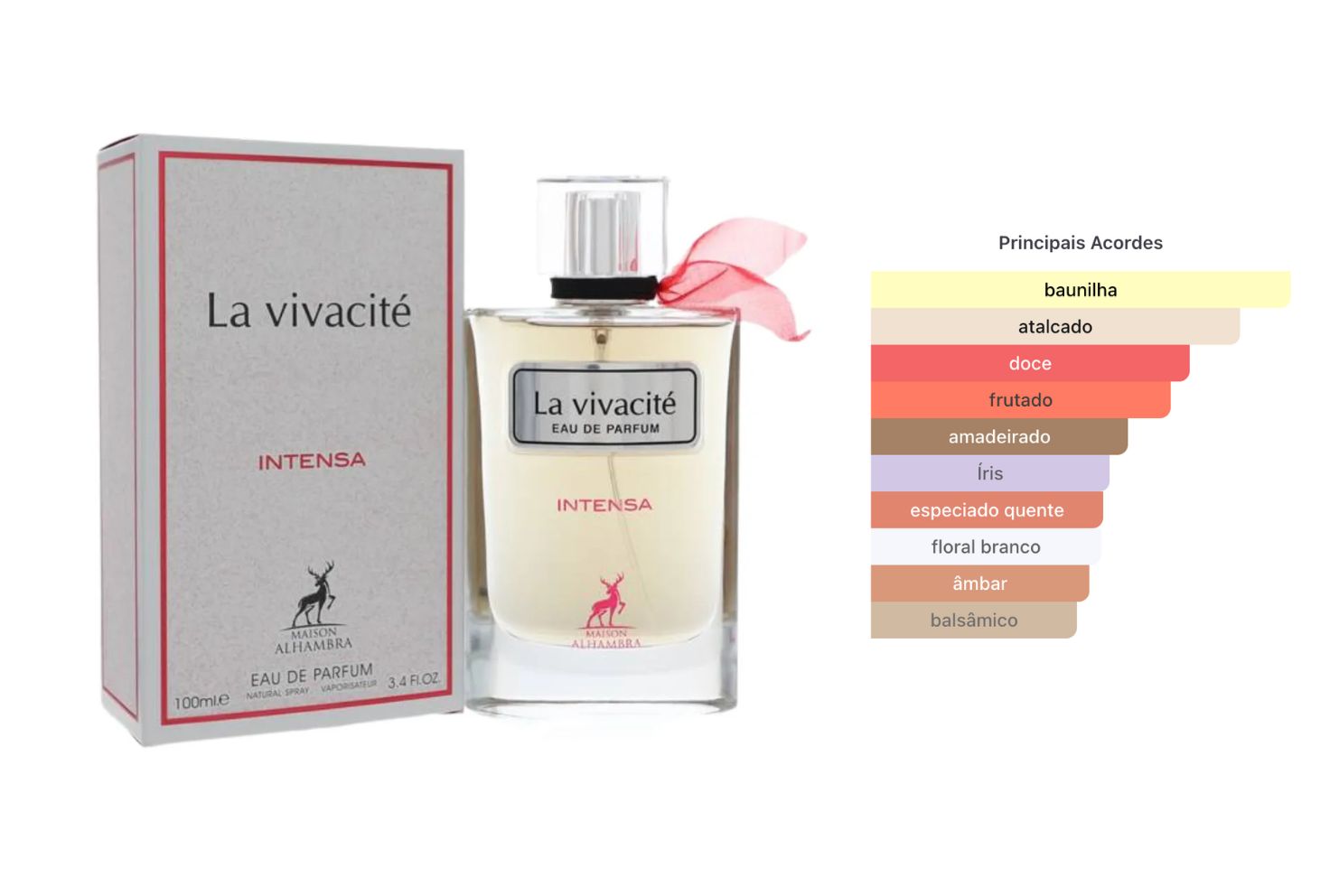 La Vivacité Intensa da Maison Alhambra é um Eau de Parfum feminino floral gourmand, lançado em 2024, conhecido por ser uma alternativa acessível e intensa ao Lancôme La Vie Est Belle Intensément.